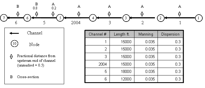 Note that there are two cross-section geometries labeled A and B, which will be specified later in this tutorial. In all the channels except Channel 5, the cross-sections have been assigned at the midpoint of the channel. In Channel 5, the cross-sections are assigned at fractions 0.2 and 0.8 of the length of the channel measured from the upstream end. The DSM2 grid map includes arrows pointing from upstream to downstream, indicating the positive direction of flow.
